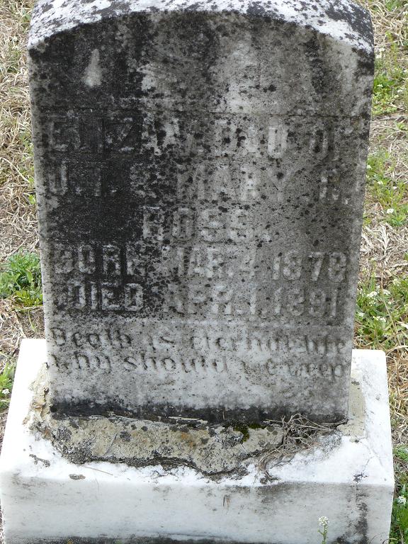 Eliza V. Ross, 12, passed away on April 1, 1891. She was buried in Union Baptist Church Cemetery. In addition to her parents she was survived by her brother, Sam Henry Ross, and sister, Lilly R. Ross Bowen.