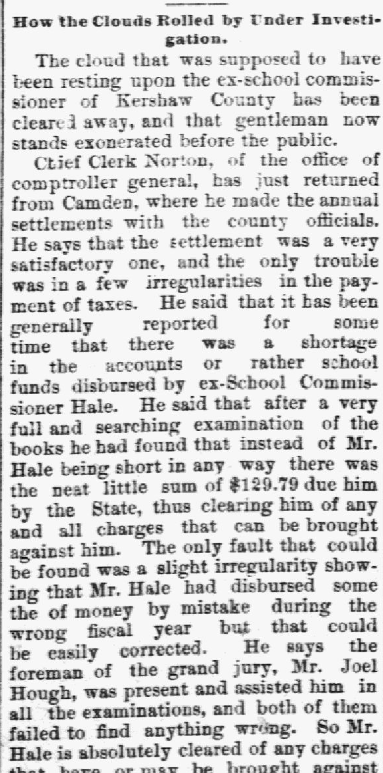 How the Clouds Rolled by Under Investivation. The cloud that was supposed to have been resting upon the ex-school commissioner of Kershaw County has been cleared away, and that gentleman now stands exonerated before the public. Chief Clerk Norton, of the office of comptroller general, has just returned from Camden, where he made the annual settlements with the county officials. He says that the settlement … Continue reading KERSHAW’S SCHOOL FUND
