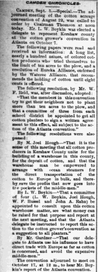 CAMDEN, Sept. 5. – Special. – The adjournment meeting of the cotton acreage convention of August 22, was called to order by Chairman Thomson at noon today. Mr. L. W. Boykin was elected a delegate to represent Kershaw county at the cotton grower’s convention in Atlanta on October 7.