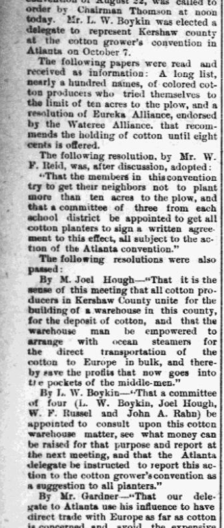 By L. W. Boykin – “That a committee of four (L. W. Boykin, Joel Hough, W. F. Russel and John A Rahn) be appointed to consult upon this cotton warehouse matter, see what money can be raised for that purpose and report this action to the cotton grower’s convention as a suggestion to all platers.”