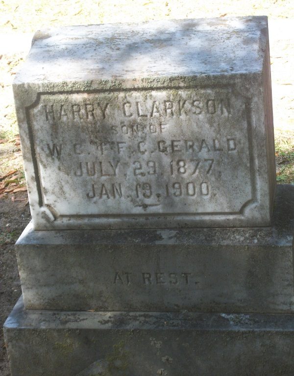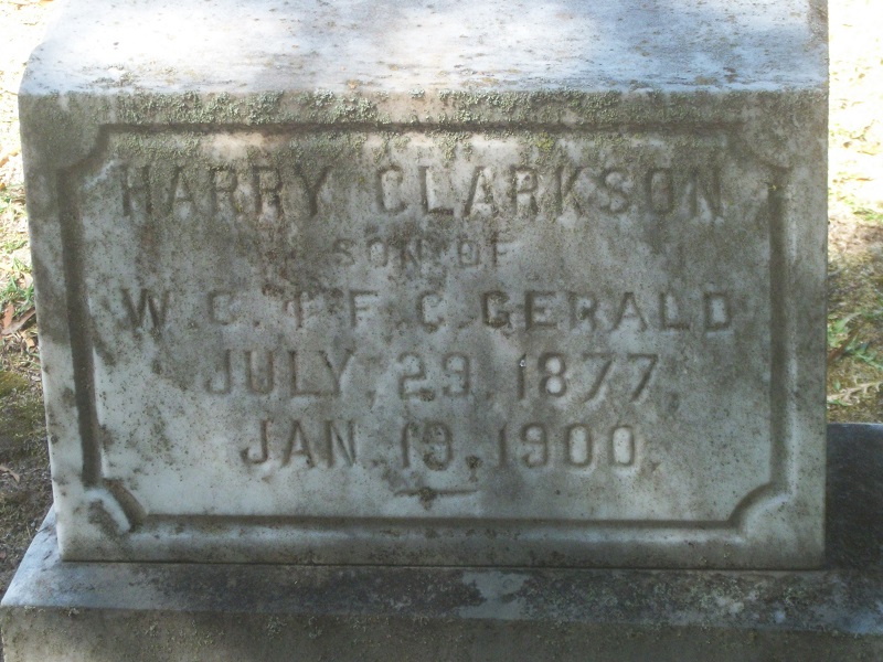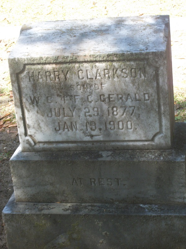H. C. Gerald was counted in the census on 05 Jun 1880 in Camden, Kershaw, South Carolina, USA, as a 3-year-old, male, single, white, son. Also in the home were; his father, Wm. C. Gerald; his mother, F C Gerald; and his siblings, R D Gerald, Jas A. Gerald, Jno. D. Gerald, A. A. Gerald, M. B. Gerald, and M. E. Gerald and a female Gerald.