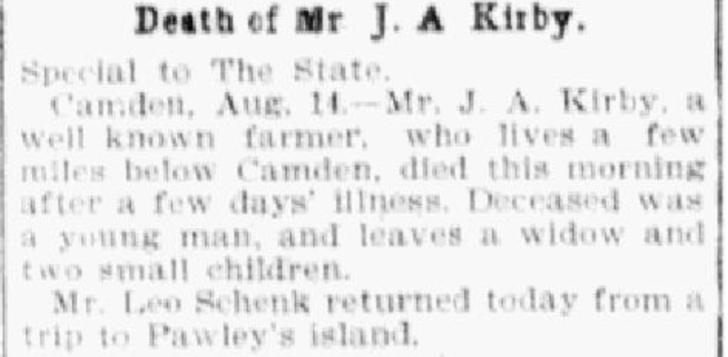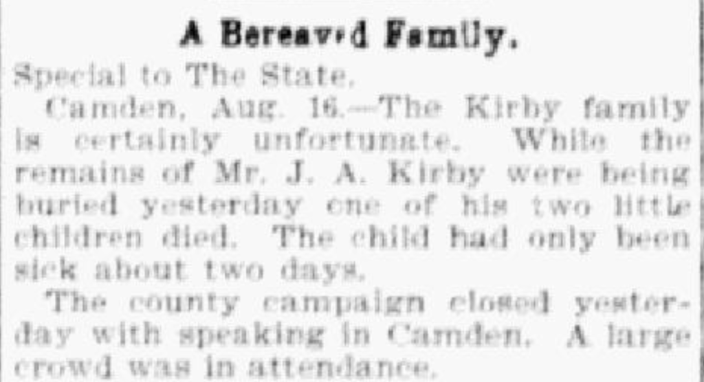 Camden, Aug. 16. – The Kirby family is certainly unfortunate. While the remains of Mr. J. A. Kirby were being buried yesterday in Camden, Kershaw, South Carolina, USA in Quaker Cemetery, one of his two little children died. The child had only been sick about two days.