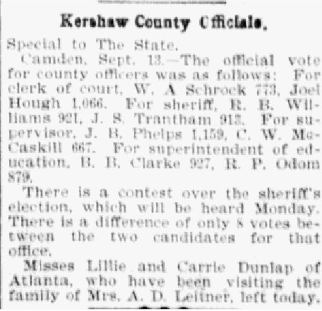 Camden, Sept. 13. – The official vote for county officers was as follows; For clerk of court, W. A. Schrock 773, Joel Hough 1,066. For sheriff, R. B. Williams 921, J. S. Trantham 913. For supervisor, J. B. Phelps 1,159. C. W. McCaskill 667. For superintndent of education, B. B. Clarke 927, R. P. Odom 879.