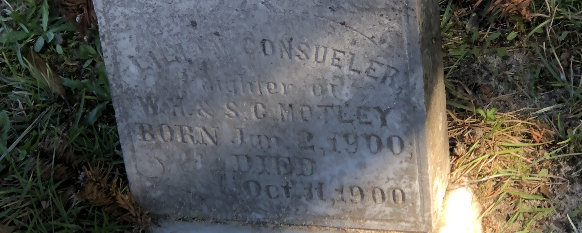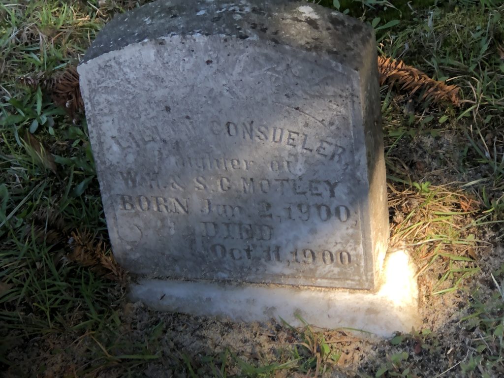 Lilian Consueler Motley, 9 months old, passed away October 11, 1900, She was buried in Elgin, Kershaw, South Carolina, USA at Smyrna United Methodist Church Cemetery.