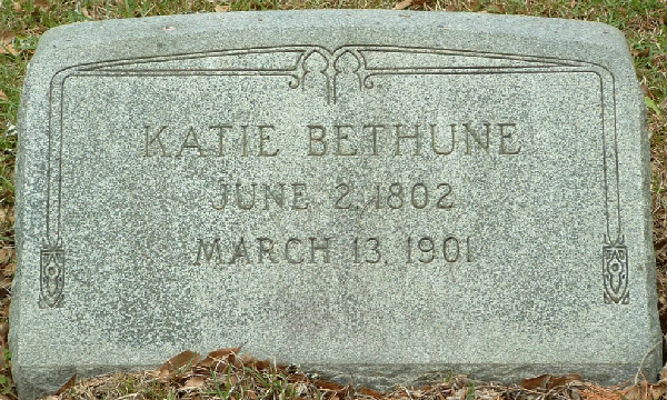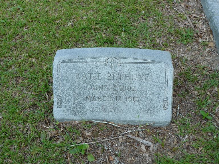 She died on 13 Mar 1901 in Bethune, Kershaw, South Carolina, USA. Katie Bethune was buried in Bethune, Kershaw, South Carolina, USA at Scotch Cemetery.