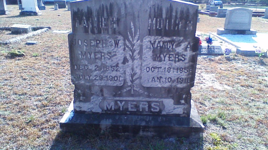 On August 26, 1942, Joseph W. Myers was mentioned as the deceased father on the death record of Benjamin Tillman Myers.