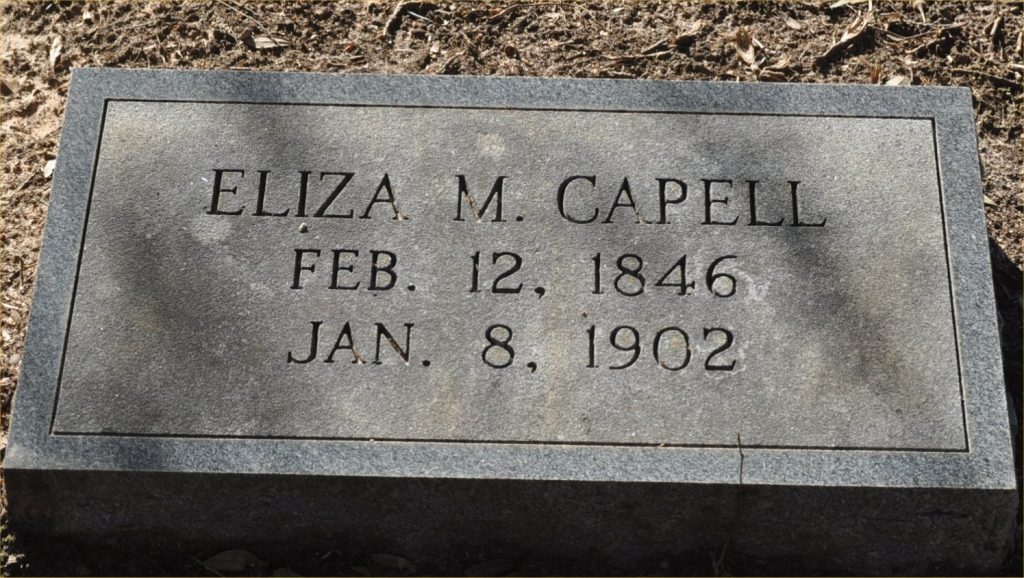 Eliza Capell was counted in the census in Jun 1900 in Kershaw, South Carolina, USA, as a 56-year-old, female, white, widowed, mother. Also in the home were; her daughter, Mary E. Swing; and her granddaughter, Belle Swing.