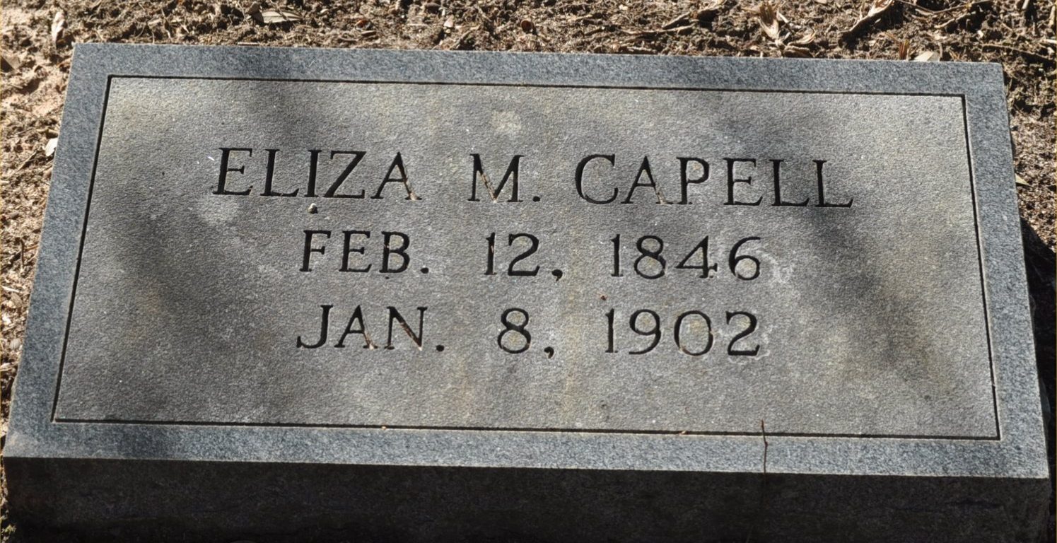 Eliza Capell was counted in the census in Jun 1900 in Kershaw, South Carolina, USA, as a 56-year-old, female, white, widowed, mother. Also in the home were; her daughter, Mary E. Swing; and her granddaughter, Belle Swing.