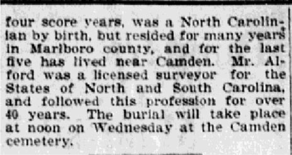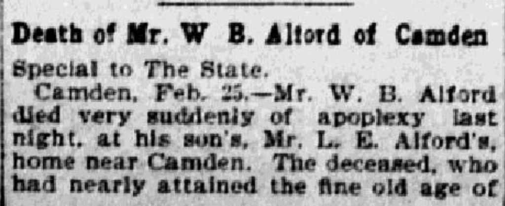 Camden, Feb. 25 – Mr. W. B. Alford died very suddenly of apoplexy last night, at his son’s. Mr. L. E. Alford’s, home near Camden. The deceased, who had nearly attained the fine old age of four score years, was a North Carolina by birth, but resided for many years in Marlboro county, and for the last five has lived near Camden. Mr. Alford was a licensed surveyor for the States of North and South Carolina, and followed this profession for over 40 years. The burial was at noon on Wednesday at the Camden cemetery.