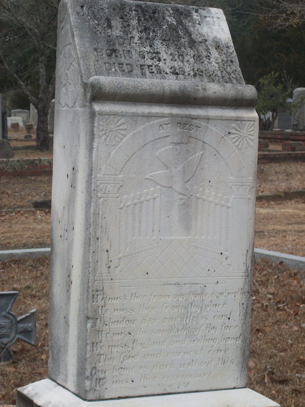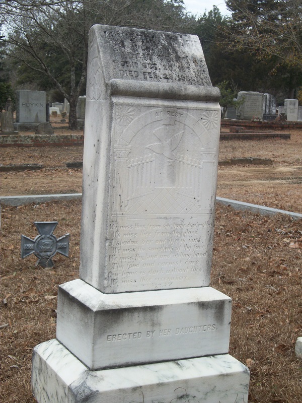 She died on 26 Feb 1902 in Sumter, South Carolina, USA. She was buried in Camden, Kershaw, South Carolina, USA at Quaker Cemetery.
