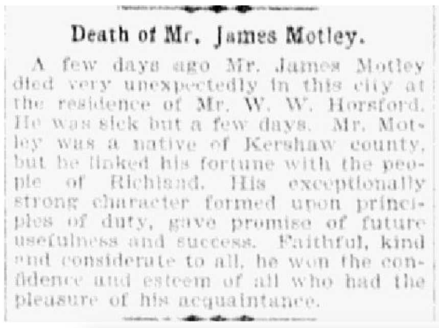 A few days ago Mr. James Motley died very unexpectedly in this city at the residence of Mr. W. W. Horsford. He was sick but a few days. Mr. Motley was a native of Kershaw county, but he linked his fortune with the people of Richland. His exceptionally strong character formed upon principles of duty, gave promise of future usefulness and success. Faithful, kind and confidence wand esteem of all who had the pleasure of his acquaintance.