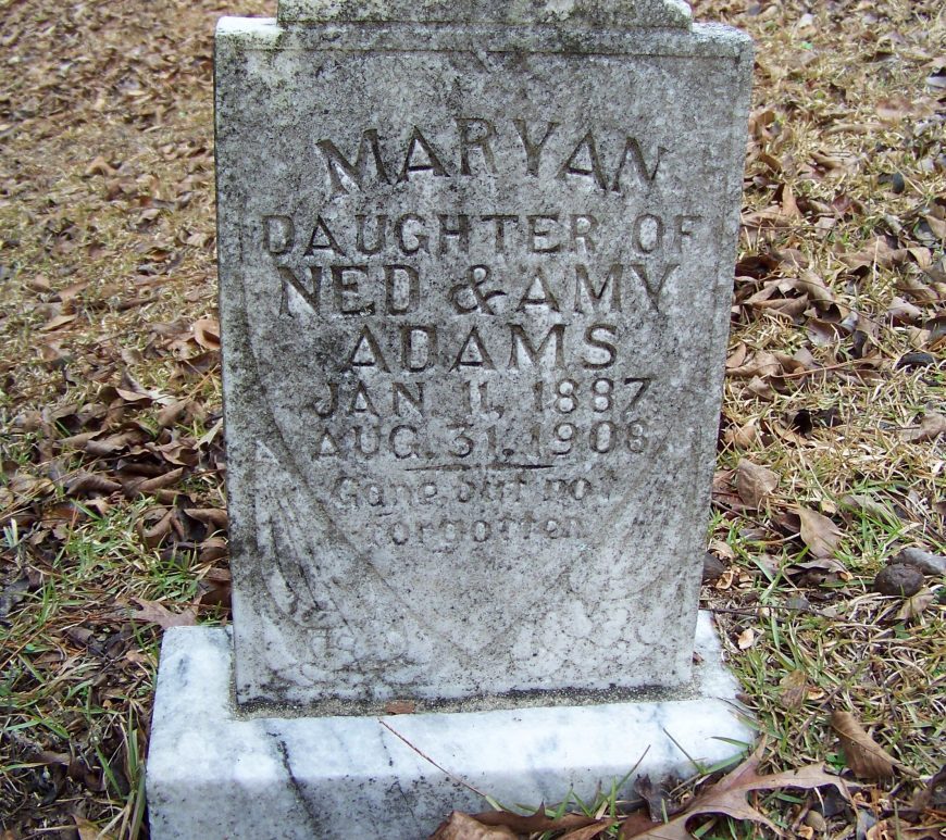 1887 Maryan Adamson was born on 11 Jan 1887 a child of Ned Adams and Amy Adams. 1902 She died on 31 Aug 1902. Maryan Adamson was buried in Camden, Kershaw, South Carolina, USA at Emmanuel United Methodist Church Cemetery. Continue reading Maryan Adams