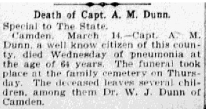 Camden, March 14. – Capt. A. M. Dunn, a well known citizen of this county, died Wednesday of pneumonia at the age of 64 years. The funeral took place at the family cemetery on Thursday. The deceased leaves several children, among them Dr. W. J. Dunn of Camden.