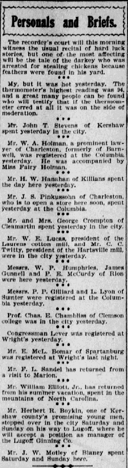 Mr. Herbert R. Boykin, one of Kershaw county’s promising young men, stopped over in the city Saturday and Sunday on his way to Lugoff, where he will accept a position as manager of the Lugoff Ginning Co.