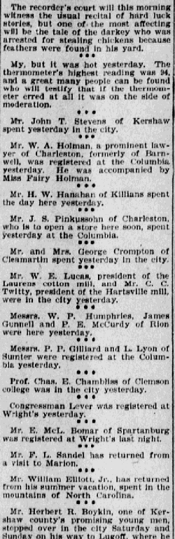 Mr. Herbert R. Boykin, one of Kershaw county’s promising young men, stopped over in the city Saturday and Sunday on his way to Lugoff, where he will accept a position as manager of the Lugoff Ginning Co.