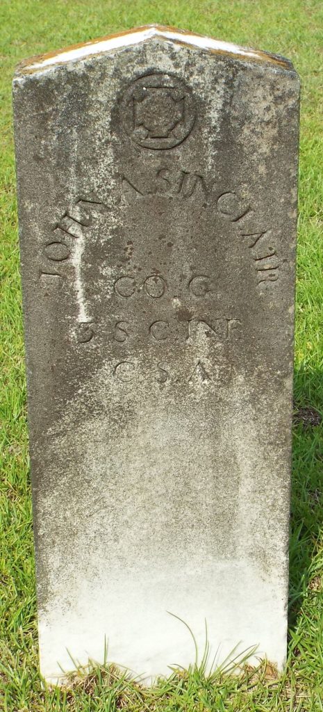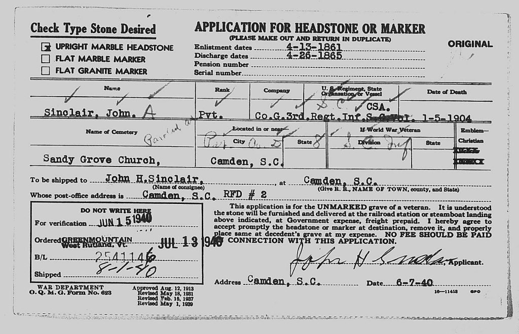 On July 7, 1940, John H Sinclair applied for a headstone for U. S. Military Veterans for his father, John A Sinclair.