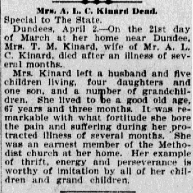 Dundees, April 2. – On the 21st day of March at her home near Dundee, Mrs. T. M. Kinard, wife of Mr. A. L. C. Kinard, died after an illness of several months.