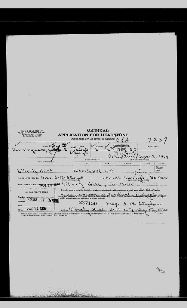 John Stover Cunningham was born on 19 Oct 1841 in Kershaw, South Carolina, USA a child of Robert Brown Cunningham and Jane Cornelia Harrison Cunningham.