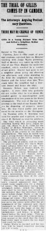 The plantations adjoin, and the trouble arose from some fire which Whittaker alleged Gillis had set out. The shooting occurred at Boykin depot, on the Southern railway early in the afternoon and young Whitaker died at the feet of a few friends before medical aid could reache him. Gillis is being defended by Mr. George Johnstone of Newberry, Judge E. D. Blakeney of Kershaw. Mr. W. M. Trantham of Camden, and Mr. Jennings of Sumter, who are making a desperate fight for their client’s life. Solicitor Thurman is being most ably assisted by Hon. M. L. Smith in the prosecution.