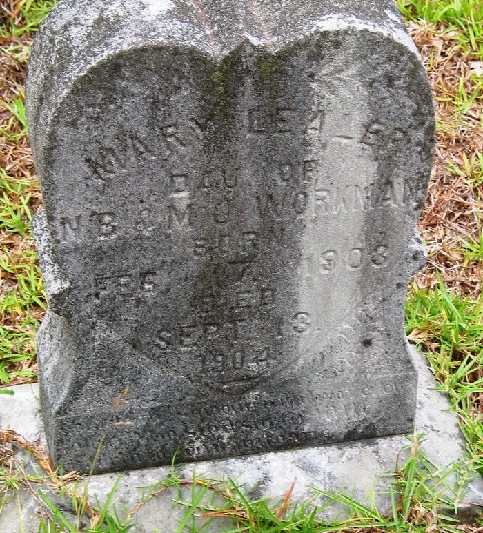 1903 Mary Lealer Workman was born on 17 Feb 1903 as the first child of N B Workman and M J. 1904 She died on 13 Sep 1904. She was buried in Camden, Kershaw, South Carolina, USA at Beulah United Methodist Church Cemetery. Continue reading Mary Lealer Workman