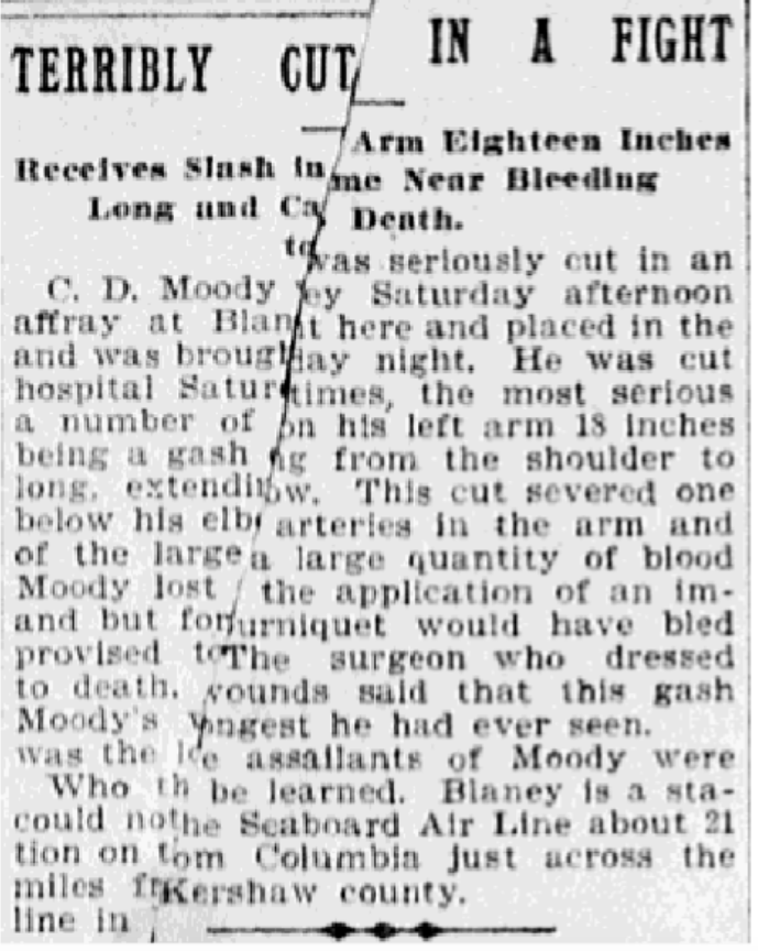 Who the assailant of Moody were could not be learned. Blaney is a station on the Seaboard Air Line about 21 miles from Columbia just across the line in Kershaw county.