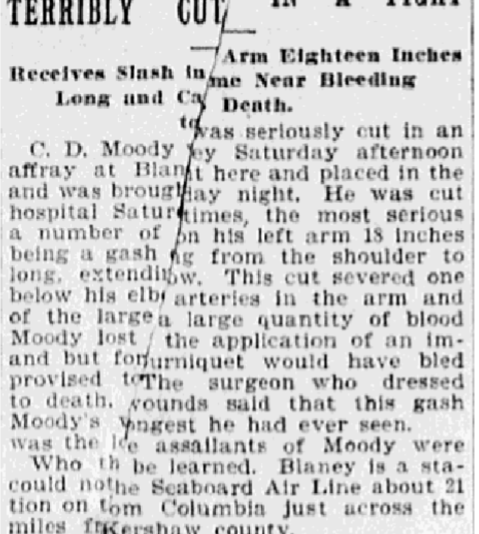 Who the assailant of Moody were could not be learned. Blaney is a station on the Seaboard Air Line about 21 miles from Columbia just across the line in Kershaw county.