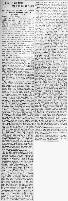 Ancrum Boykin corroborated his father in all the essential details of his testimony. He said “I was in my store and Mr. McRae Whitaker drove up in front of the store and called for me. Went to his buggy, and then I walked to where the Gillises were. The two Gillises came towards each other with their hands in their pockets as if in an attitude to fuss with me. I said to them, “I am not armed, I have come here to stop this fuss. It must be settled peaceably.” They did not address me at all but looked toward Whitaker, who was back in the buggy and they said, “The damn fuss is settled as far as we are concerned, we have had our satisfaction: if you want satisfaction come and get it.” Then I looked around and I saw Whitaker getting out of his buggy and I stopped him and I said again. “This fuss has got to be settled without any shooting. The two Gillises were still standing there with their hands in their pockets. Whitaker had not put his hand in his pocket: he walked up calm and cool, his hand swinging by his side, I insisted that the trouble could be settled without shooting and that both men should give me their pistols. G. E. Gillis said he would fight any way and Whitaker said he would fight any way. I got In between them and asked for their pistols. J. E. Gillis drew his foot across the ground and said, ‘Damn It, If you want to fight cross that line.” Whitaker looked as If he did not want to fight. I was still calling for the pistols. Gills said he would give up his pistol and Whitaker said he would give up his. Whitaker came by me and took his pistol out of his pocket and handed it across to me. Reached out my hand for it. Ed Gillis pulled out his pistol and J. A. Gillis said, “Don’t give up your pistol,” and J. E. Gillis said, “No, damn it, battle it out,” and fired two shots and Whitaker hit the ground. His pistol dropped out of his hand. J. E. Gills ran around with his pistol to shoot again. I scuffled with J. E. Gillis to keep him from shooting any more, he said, “For God’s sake, don’t shoot him any more, he is dead.”