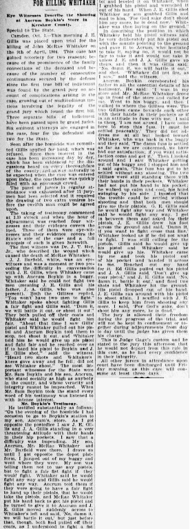 Ancrum Boykin corroborated his father in all the essential details of his testimony. He said “I was in my store and Mr. McRae Whitaker drove up in front of the store and called for me. Went to his buggy, and then I walked to where the Gillises were. The two Gillises came towards each other with their hands in their pockets as if in an attitude to fuss with me. I said to them, “I am not armed, I have come here to stop this fuss. It must be settled peaceably.” They did not address me at all but looked toward Whitaker, who was back in the buggy and they said, “The damn fuss is settled as far as we are concerned, we have had our satisfaction: if you want satisfaction come and get it.” Then I looked around and I saw Whitaker getting out of his buggy and I stopped him and I said again. “This fuss has got to be settled without any shooting. The two Gillises were still standing there with their hands in their pockets. Whitaker had not put his hand in his pocket: he walked up calm and cool, his hand swinging by his side, I insisted that the trouble could be settled without shooting and that both men should give me their pistols. G. E. Gillis said he would fight any way and Whitaker said he would fight any way. I got In between them and asked for their pistols. J. E. Gillis drew his foot across the ground and said, ‘Damn It, If you want to fight cross that line.” Whitaker looked as If he did not want to fight. I was still calling for the pistols. Gills said he would give up his pistol and Whitaker said he would give up his. Whitaker came by me and took his pistol out of his pocket and handed it across to me. Reached out my hand for it. Ed Gillis pulled out his pistol and J. A. Gillis said, “Don’t give up your pistol,” and J. E. Gillis said, “No, damn it, battle it out,” and fired two shots and Whitaker hit the ground. His pistol dropped out of his hand. J. E. Gills ran around with his pistol to shoot again. I scuffled with J. E. Gillis to keep him from shooting any more, he said, “For God’s sake, don’t shoot him any more, he is dead.”