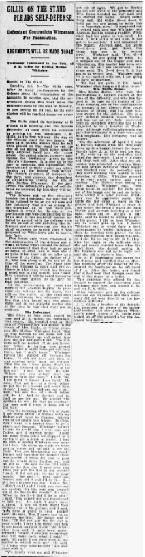 The State closed its testimony at 11 o’clock this morning and the defense proceeded at once with its evidence by putting up the defendant, J. E. Gillis, as the first witness. He was on the witness stand for two hours. As soon as it became known that he had been placed on the stand to tell his side of the killing Main street practically emptied itself into the court house. He denied almost in every particular the testimony given by the State’s witnesses. It is now up to the jury to reconcile the diametrical differences and by their verdict say which version of the killing they accept. The State’s evidence, if accepted by the jury, will convict the defendant of, unjustifiably taking the life of John McRea Whitaker. If the jury accept the defendant’s plea of self-defense as narrated by him they will acquit him.