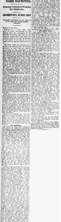 The State closed its testimony at 11 o’clock this morning and the defense proceeded at once with its evidence by putting up the defendant, J. E. Gillis, as the first witness. He was on the witness stand for two hours. As soon as it became known that he had been placed on the stand to tell his side of the killing Main street practically emptied itself into the court house. He denied almost in every particular the testimony given by the State’s witnesses. It is now up to the jury to reconcile the diametrical differences and by their verdict say which version of the killing they accept. The State’s evidence, if accepted by the jury, will convict the defendant of, unjustifiably taking the life of John McRea Whitaker. If the jury accept the defendant’s plea of self-defense as narrated by him they will acquit him.