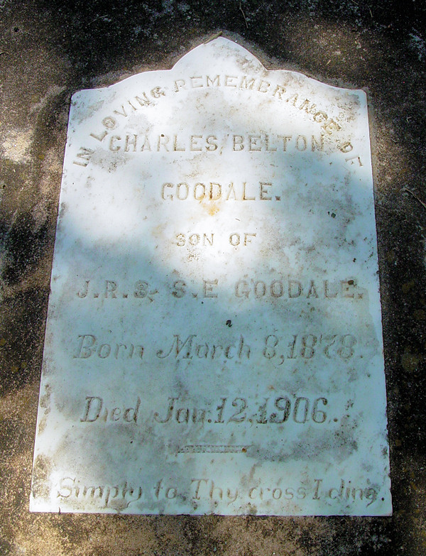 Charles B Goodale was counted in the census in Jun 1900 in Camden, Kershaw, South Carolina, USA, as a 22-year-old, male, single, white, son. Also in the home were; his father, John R Goodale; his mother, Sarah E Goodale; his siblings, William D Goodale,Roland N Goodale, Thomas E Goodale, and Sallie R Goodale; their; daughter-in-law, Mary L Goodale; and grandsons, William L Goodale and Thomas R. Shiver.
