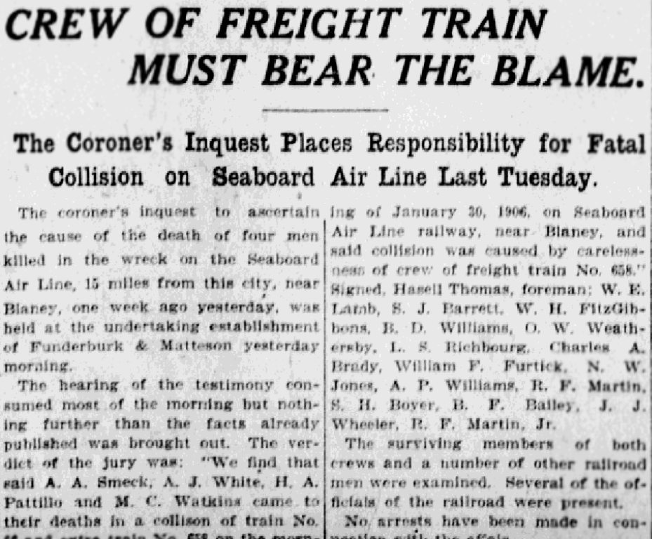 The hearing of the testimony consumed most of the morning but nothing further than the facts already published was brought out. The verdict of the jury was; “We find that said A. A. Smeck; A. J. White, H. A. Pattillo and M. C. Watkins came to their deaths in a collison of train No. 66 and extra train No. 658 on the morning of January 30, 1906, on Seaboard Air Line railway, near Blaney, and said collision was caused by carelessness of crew of freight train No. 658.” Signed, Hasell Thomas, foreman; W. E. Lamb, S. J. Barrett, W. H. FitzGibbons, B. D. Williams, O. W. Weathersby, L. S. Richboug, Charles A. Brady, William F. Furtick, N. W. Jones, A. P. Williams, R. F. Martin, S. H. Boyer, B. F. Bailey, J. J. Wheeler, R. F. Martin, Jr.