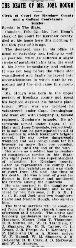 Camden, Feb. 12 – Mr. Joel Hough, clerk of the court for Kershaw county, died at his home here this morning in the 66th year of his age.