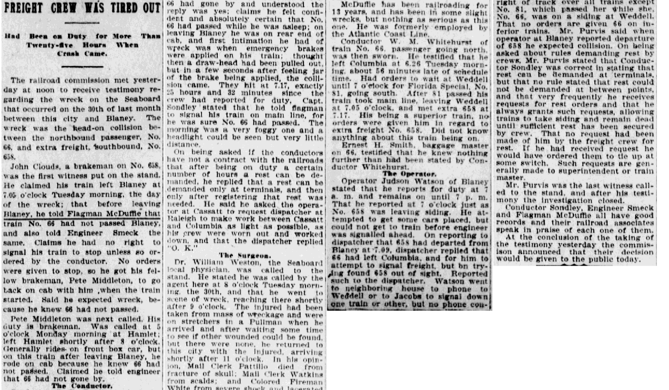 Conductor G. B. Sondley of train, extra, 658 proved to be the star witness. His testimony was as follows; Called at 5:15 a. m., at Hamlet, Monday morning; left Hamlet 6:40; should have left at 6:30; stayed at Osborne 15 minutes; Kollock 50 minutes; Cheraw 2 hours and 15 minutes; Gillespie siding 10 minutes; Patrick 30 minutes; Middendorf 15 minutes; McBee 3 hours and 10 minutes; Bethune 1 hour; Cassatt 1 hour; got car off track here; took part of the train over to Sheppard and left it there, taking wrecking crew back to Cassatt; spent 4 hours and 30 minutes in placing car back on track; Spalding 5 minutes; Camden 50 minutes, and on leaving Camden he received orders to meet No.66 at Blaney. Arrived at Blaney about 6 o’clock Tuesday morning, having been on duty since 5:45 Monday Morning; he and his crew went to sleep after getting in on siding; after being at Blaney about an hour, the Florida Special, No. 21, , passed, going south. Mr. Sondley called to some of his crew to ascertain if no. 66 had gone by and understood the reply was yes; claims he felt confident and absolutely certain that No. 66 had passed while he was asleep; on leaving Blaney he was on rear end of cab, and first intimation he had of wreck was when emergency brakes were applied on his train; thought then a draw-head had been pulled out, but in a few seconds after feeling jar of the brake being applied, the collision came. They hit at 7:17, exactly 25 hours and 32 minutes since the crew had reported for duty, Capt. Sonley stated that he told flagman to signal his train on main line, for he was sure 66 had passed. The morning was a very foggy one and a headlight could be seen but very little distance.