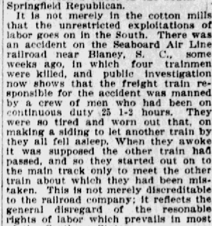 It is not merely in the cotton mills that the unrestricted exploitations of labor goes on in the South. There was an accident on the Seaboard Air Line railroad near Blaney, S. C., some weeks ago, in which four trainmen were killed, and public investigation now shows that the freight train responsible for the accident was manned by a crew of men who had been on continuous duty 25 1-2 hours. They were so tired and worn out that, on making a siding to let another train by they all fell asleep, when they awoke it was supposed that the other rain had passed, and so they started out on to the main track only to meet the other train about which they had been mistaken. This is not merely discreditable to the railroad company; it reflects the general disregard of the reasonable right of labor which prevails in most of the Southern States.