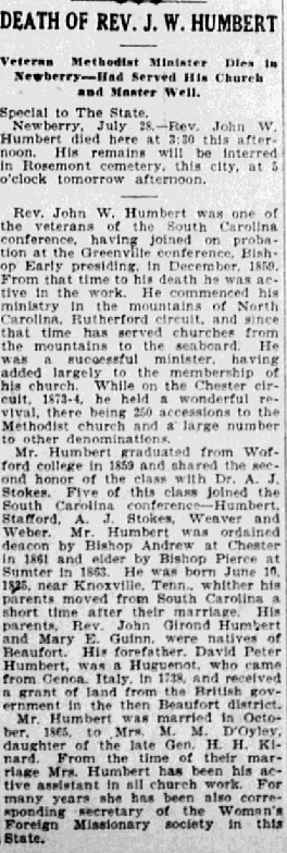 Mr. Humbert graduated from Wofford college in 1859 and shared the second honor of the class with Dr. A. J. Stokes. Five of this class joined the South Carolina conference – Humbert, Stafford, A. J. Stokes, Weaver and Weber. Mr. Humbert was ordained deacon by Bishop Andrew at Chester In 1861 and elder by Bishop Pierce at Sumter In 1863. He was born June 10, 1925, near Knoxville, Tenn., whither his parents moved from South Carolina a short time after their marriage. His parents. Rev. John Girond Humbert and Mary E. Guinn, were natives of Beaufort. His forefather, David Peter Humbert, was a Huguenot, who came from Genoa, Italy, In 1738, and received a grant of land from the British government in the then Beaufort district.