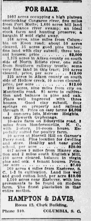 20 acres at Horrell Hill on Garner’s Ferry road. Fine location for dwelling and store. Healthy and near good school. Healthy and near good school, per acre . . . . . . . . . . . .$20