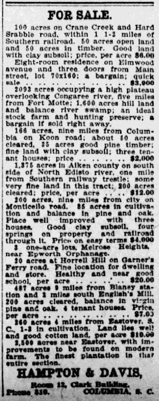 20 acres at Horrell Hill on Garner’s Ferry road. Fine location for dwelling and store. Healthy and near good school. Healthy and near good school, per acre . . . . . . . . . . . .$20