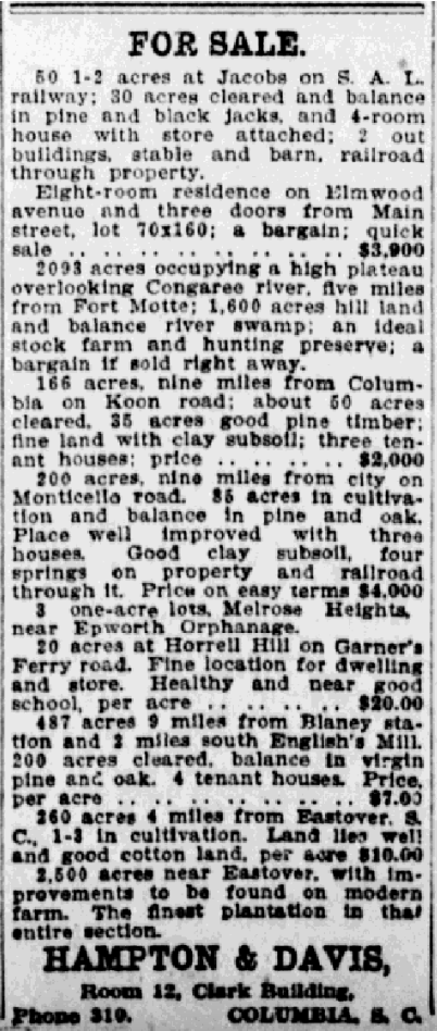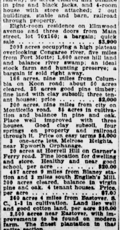 20 acres at Horrell Hill on Garner’s Ferry road. Fine location for dwelling and store. Healthy and near good school. Healthy and near good school, per acre . . . . . . . . . . . .$20
