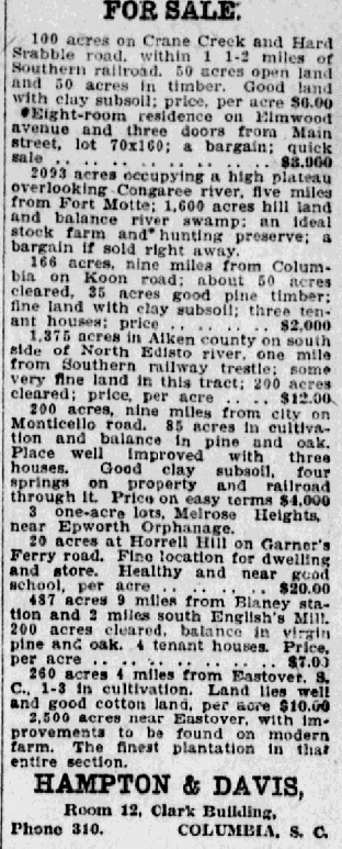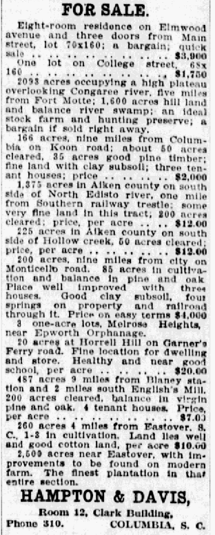 100 acres on Crane Creek and Hard Scrabble road, within 1 1-2 miles of Southern railroad, 50 acres open land and 50 acres in timber. Good land with clay subsoil; price per acre $6.00 Eight-room residence on Elmwood avenue and three doors from Main street, lot 70 x 160; a bargain; quick sale . . . . . . . . . . . . … Continue reading For Sale