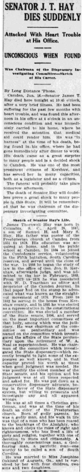 Camden, Jan. 16.-Senator James T. Hay died here tonight at 10:45 o’clock, after a very brief illness. He had been suffering for the past few months with heart trouble, and was found this afternoon in his office at 4 o’clock in an unconscious condition and was immediately carried to his home, where he received the attention that medical aid could render him. He was “in harness” at the time of his death, being found in his office, where he had gone immediately after dinner to work. His death came as a great surprise to many people and is a decided shock to Camden. He was one of the most prominent citizens of Kershaw, and has served her in many capacities, both as a legislator and as a citizen.