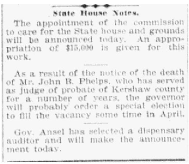 As a result of the notice of the death of Mr. John B. Phelps, who has served as judge of probate of Kershaw county for a number of years, the governor will probably order a special election to fill the vacancy some time in April.