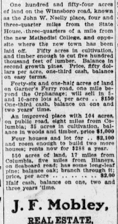 Forty-six and one-half acres of land on Garner’s Ferry road, one mile beyond the Orphanage; will sell in 5 and 10 acre lots at, per acre . . . . . . . . . . . . . .$150 One -third cash, balance on one and two years’ time.