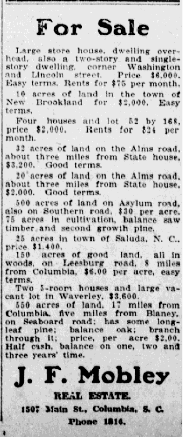 550 acres of land, 17 miles from Columbia, five miles from Blaney, on Seaboard road; has some long-leaf pine; balance oak; branch through it; price, per acre $2.00. Half cash, balance on one, two and three years’ time.