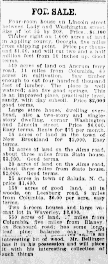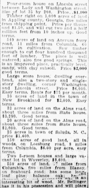 549 acres of land on Ancrum ferry road, 11 miles from Columbia, 60 acres in cultivation. Saw timber enough to cut four hundred thousand feet of lumber. The place is well watered; also five good springs. This is an improved place, practically level, sandy, with clay subsoil. Price $2,000 good terms.