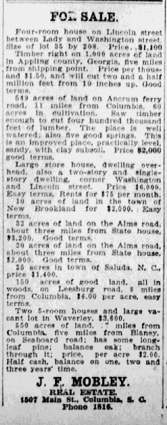 550 acres of land, 17 miles from Columbia, five miles from Blaney, on Seaboard road; has some long-leaf pine; balance oak; branch through it; price, per acre $2.00. Half Cash, balance on one, two and three years’ time.