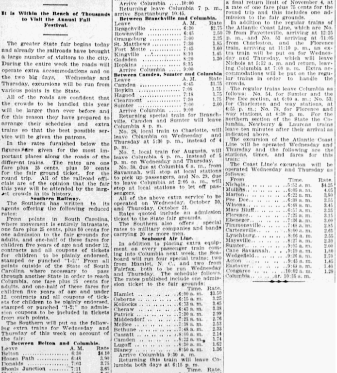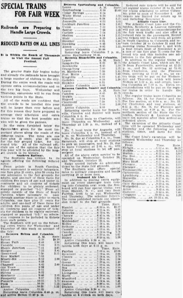 The Atlantic Coast Line and the Columbia, Newberry & Laurens railroads will put on special accommodations for the fair week traffic and also offer a reduce rate to the passengers. Round trip tickets will be sold from all points in South Carolina to Columbia and return October 26 to October 31 and for morning trains November 1, and with a final return limit of November 4, at a rate of one fare plus 75 cents for the round trip and this includes on admission to the fair grounds.