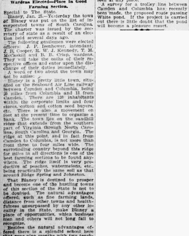 Blaney is a pretty little town, situated on the Seaboard Air Line railway between Camden and Columbia, being 20 miles from Columbia and 13 from Camden. There are 130 inhabitants within the corporate limits and four stores, cotton and cotton seed buyers, etc. There is also a movement on foot at the present time to organize a bank. The town lies on the sandhill ridge that extends from the southern part of Virginia through North Carolina, South Carolina and Georgia. The ridge at this point, and in fact from Camden to Columbia, is not more than from three to four miles wide. The surrounding country beyond this ridge for miles in all direction is one of the best farming section to be found anywhere. The ridge itself is very productive of peaches, watermelons, etc., being practically the same soil as that around Ridge Spring and Johnston.