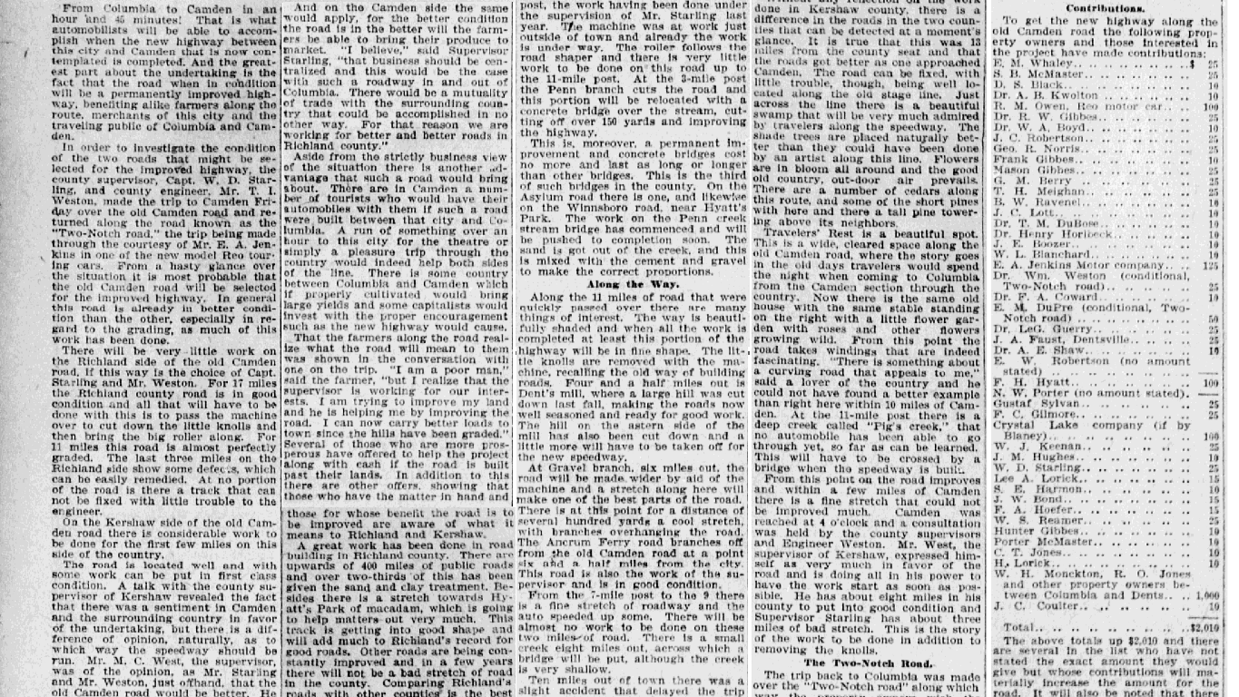 The above totals up $2,010 and there are several in the list who have not stated the exact amount they would give but whose contributions will materially increase the amount for the road. It will also be noted that there are a few in the above list who favor the Two-Notch road. There is little doubt that the road will be built and with the 60-foot charter that the county has over the roadway a greater improved highway should be the result if those on the other side do their part. The trees will be trimmed and Columbia and Camden will be connected in a business and social way for the benefit of those here, those in Camden and the farmers along the way.