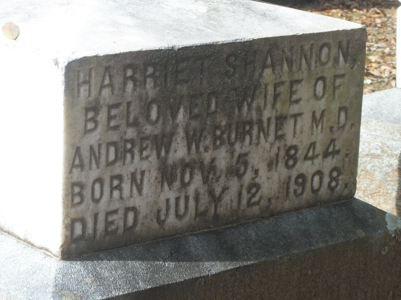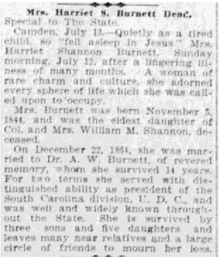 Camden, July 13 – Quietly as a tired child, she “fell asleep in Jesus” Mrs. Harriet Shannon Burnett, Sunday morning, July 12, after a lingering illness of many months. A woman of rare charm and culture, she adorned every sphere of life which she was called upon to occupy.